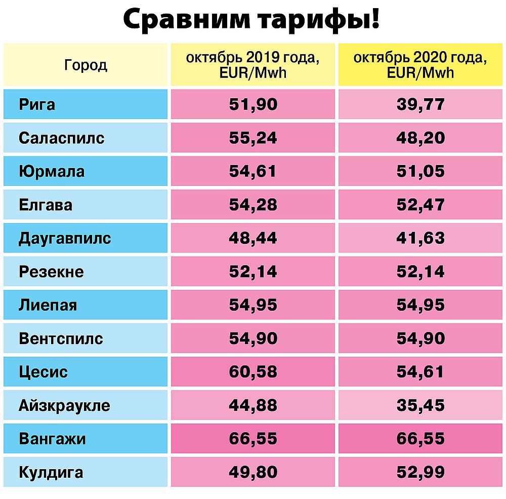 Например, в Риге тарифы на тепловую энергию будут ниже прошлогодних на 23,4%, в Даугавпилсе – на 14,1%, в Валмиере – на 16,3%, в Цесисе – на 9,9%, в Айзкраукле – на 21%, в Кекаве – на 31%, в Пиньки – на 27,8% и др.